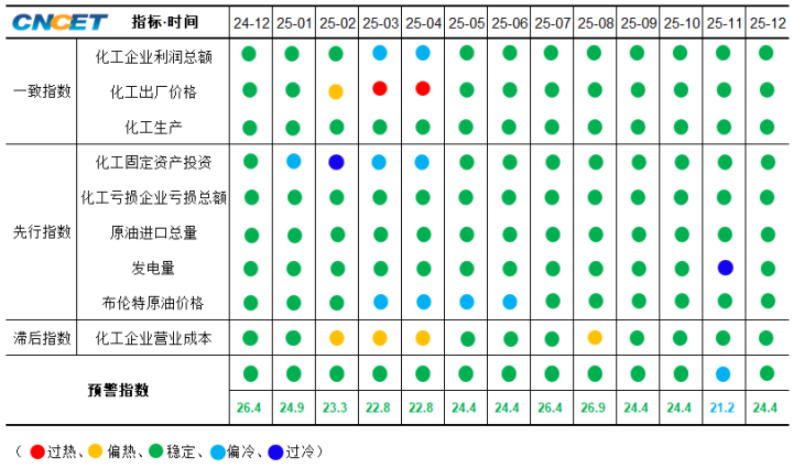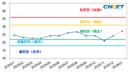 2025年12月份,化工消费需求不断恢复,行业生产稳定增长,行业亏损面下降至年内最低水平,利好化工行业景气回升,测算到2026年1月份综合预警指数初值为27.4,比2025年12月份上涨3.0点。